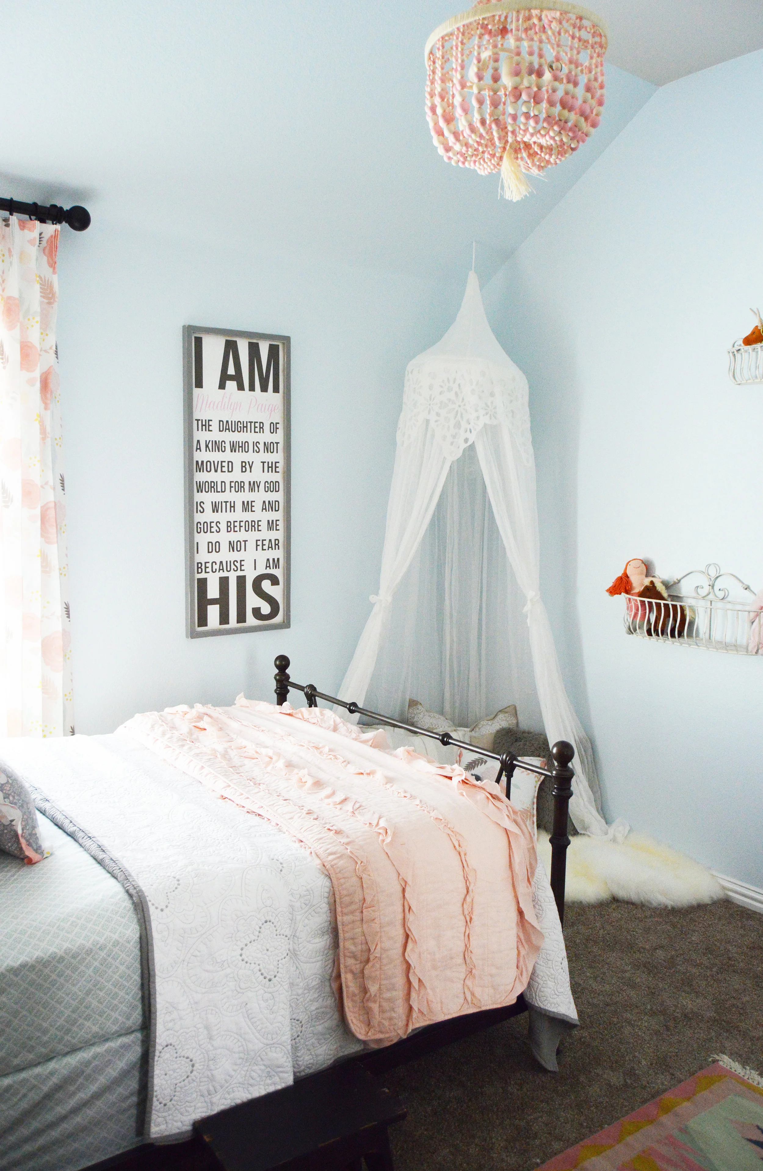 I know how much my toddler loves seeing her name written down, so I wanted to make sure to incorporate Madilyn's name in the room design. The customized tall wood "I AM HIS" sign was created just for her by the Etsy store, Pretty in Polka Dots. I loved it so much I've already ordered a different piece from this store for another client.