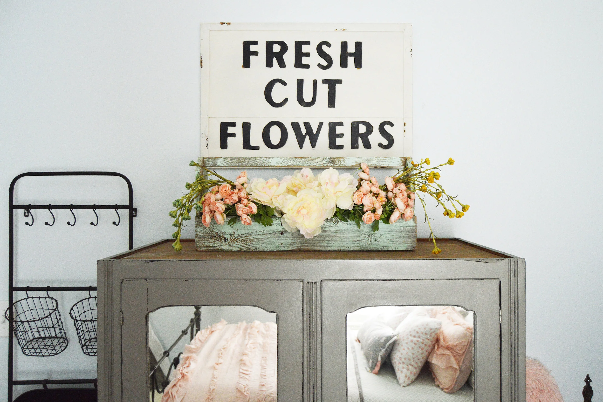 I scored this pink little rocker and distressed mint tool box (now a floral display) from the Canton flea market. $25 for both. Um, yes.