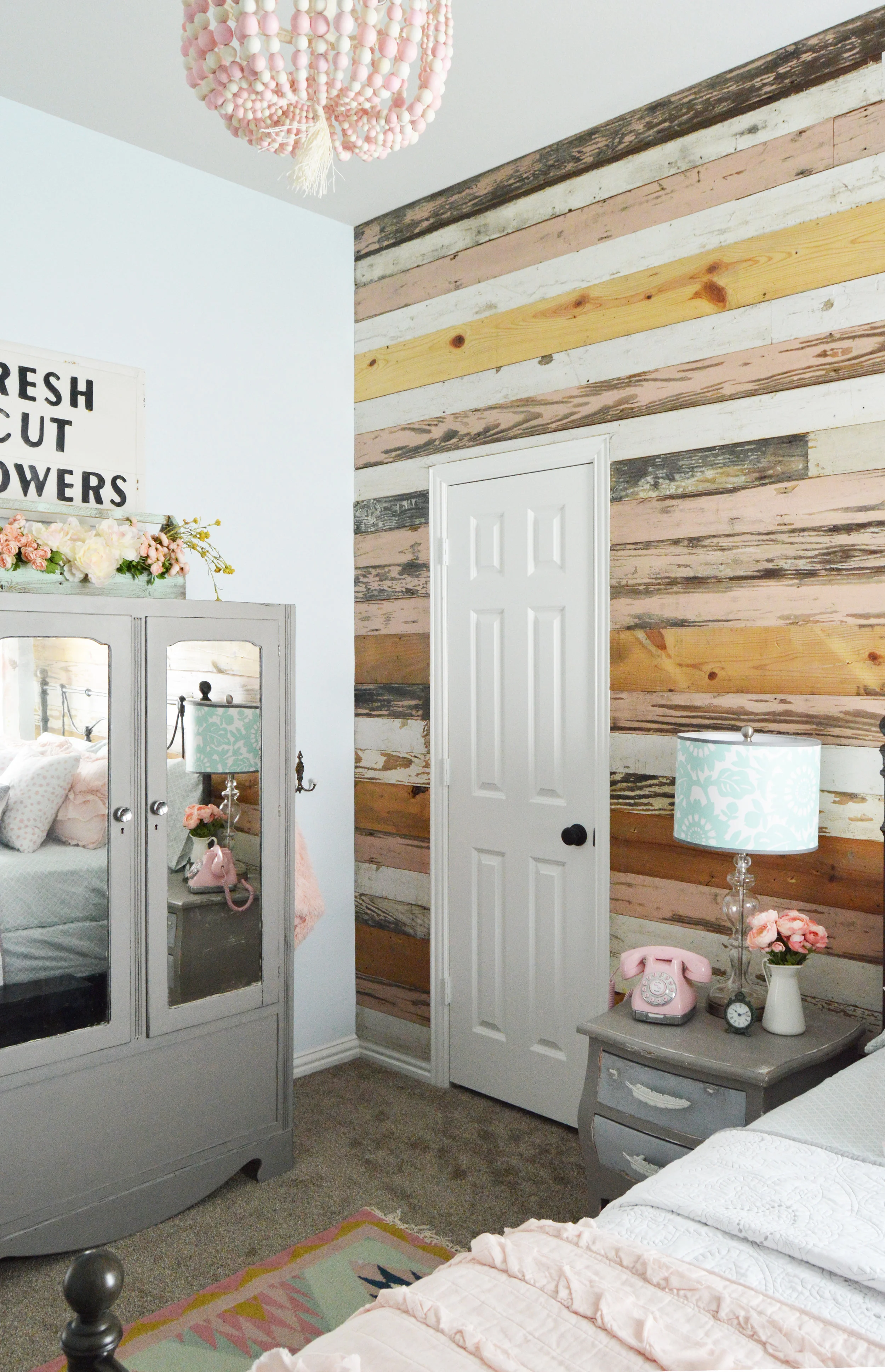 The focal point of the room is the wall. Those boards are antique reclaimed wood. I saw a few pink boards at Old Texas Wood and begged them to find as many more as possible. As always, they came through. The pink boards are mixed in with some natural, wide plank boards, some weathered grey boards, and distressed white boards. I absolutely love the end result.